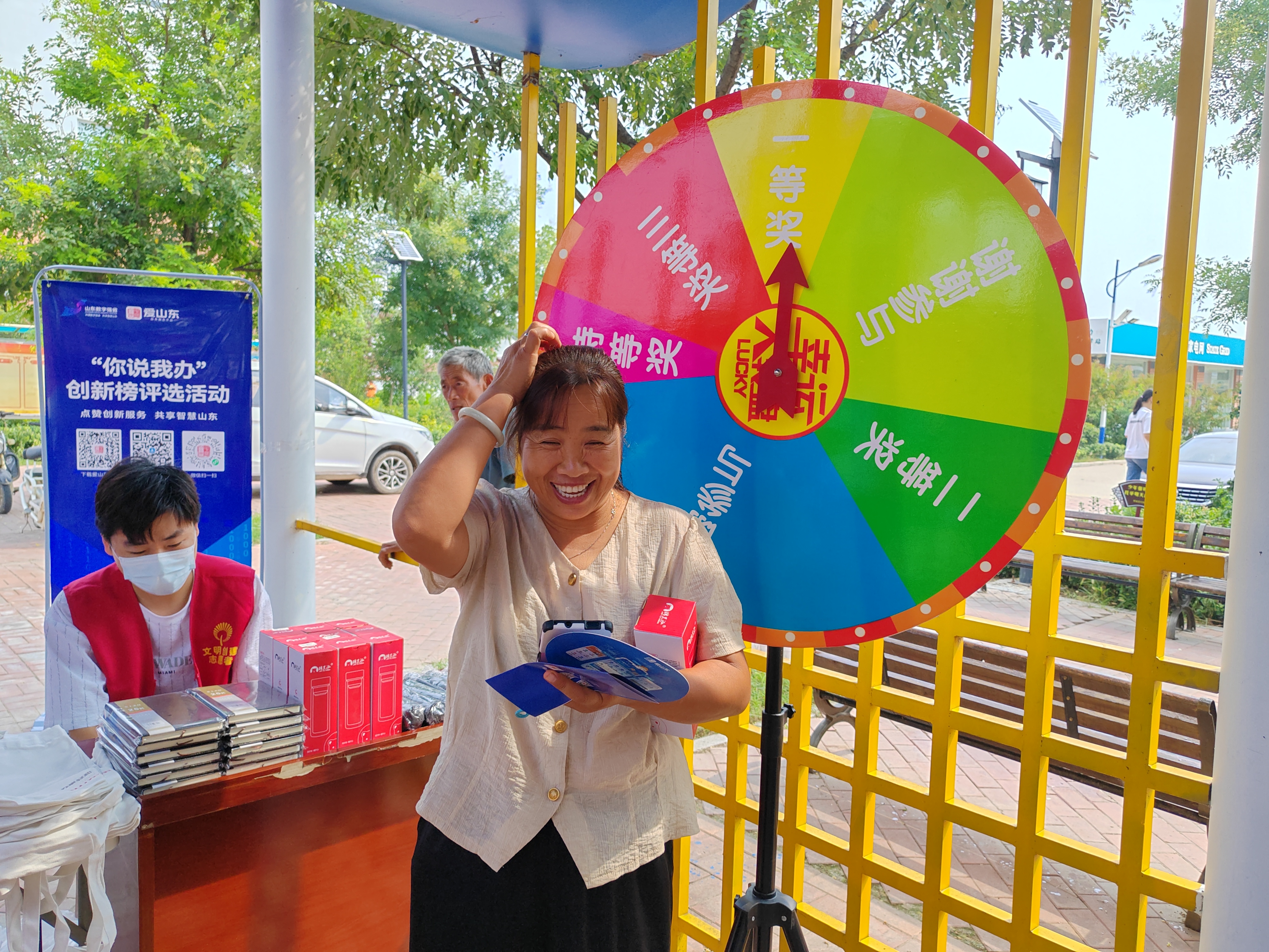活動現場采用大轉盤小游戲,鼓勵群眾積極參與“愛山東”你說我辦創新評選活動,針對自己喜歡的本地服務應用 進行點贊,對于“愛山東”有好的意見和建議進行積極填報。同時對社區居民提出的有關智慧社區建設方面的意見,都一一記錄,為我縣村臺標桿型智慧社區建設打下堅實的基礎。