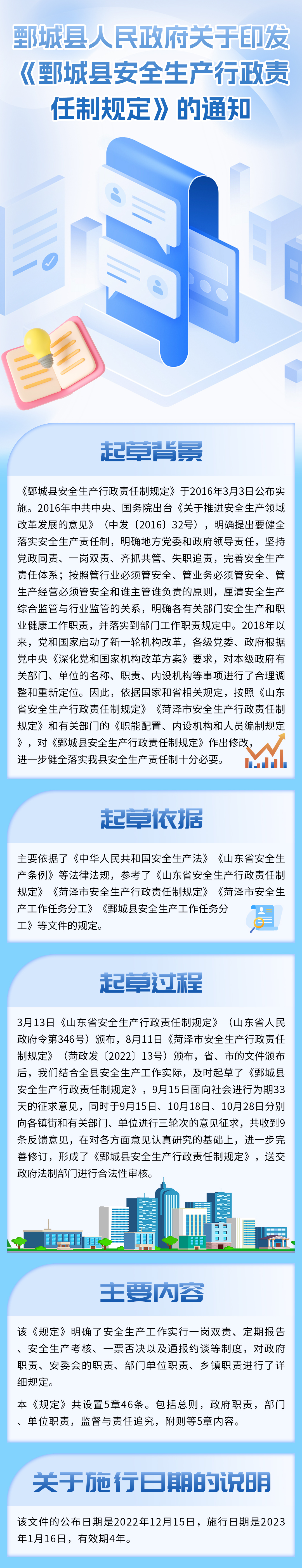 標(biāo)  題: 【圖文解讀】鄄城縣人民政府關(guān)于印發(fā)《鄄城縣安全生產(chǎn)行政責(zé)任制規(guī)定》的通知 發(fā)布日期: 2022 年 12 月 16 日