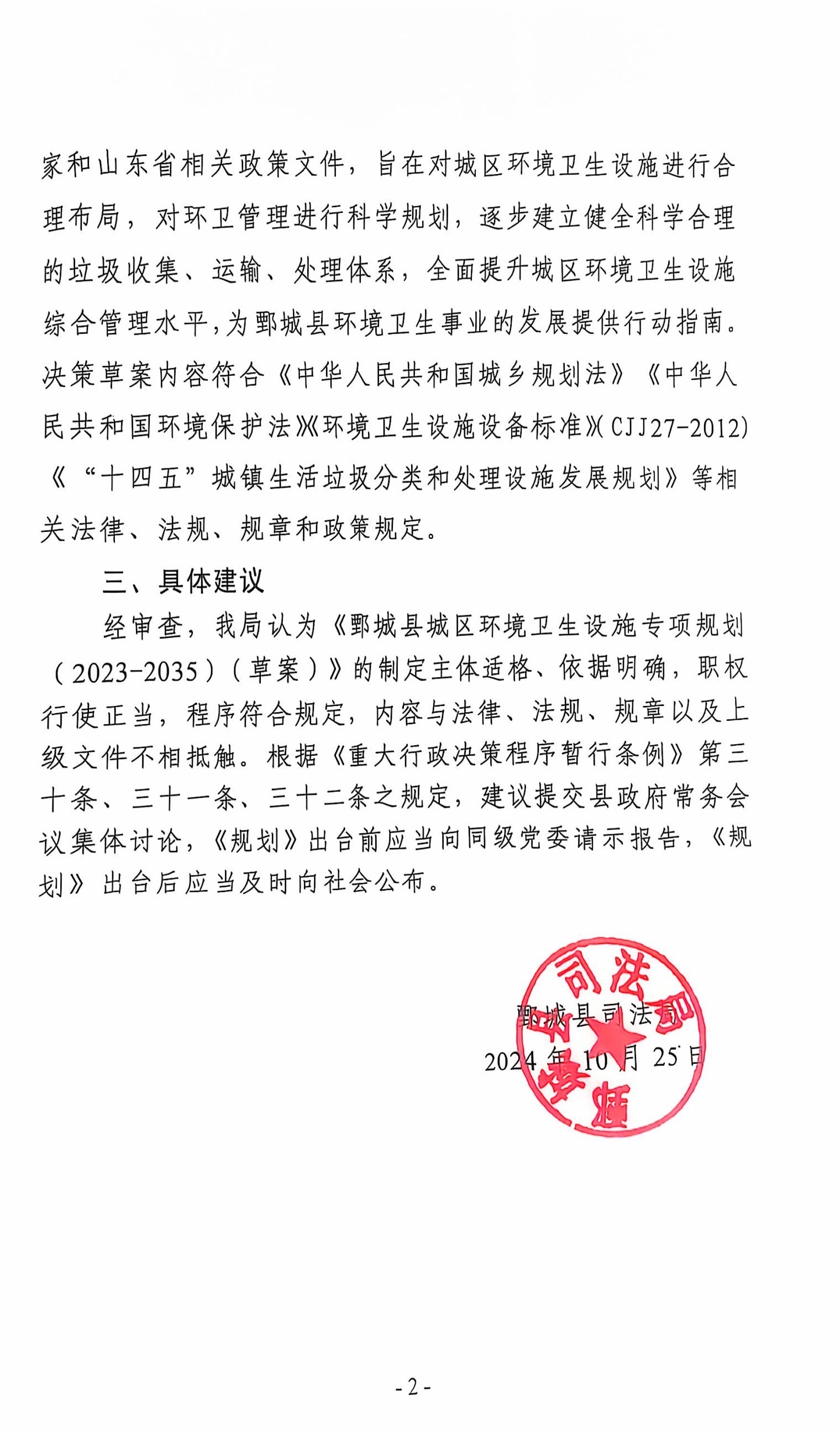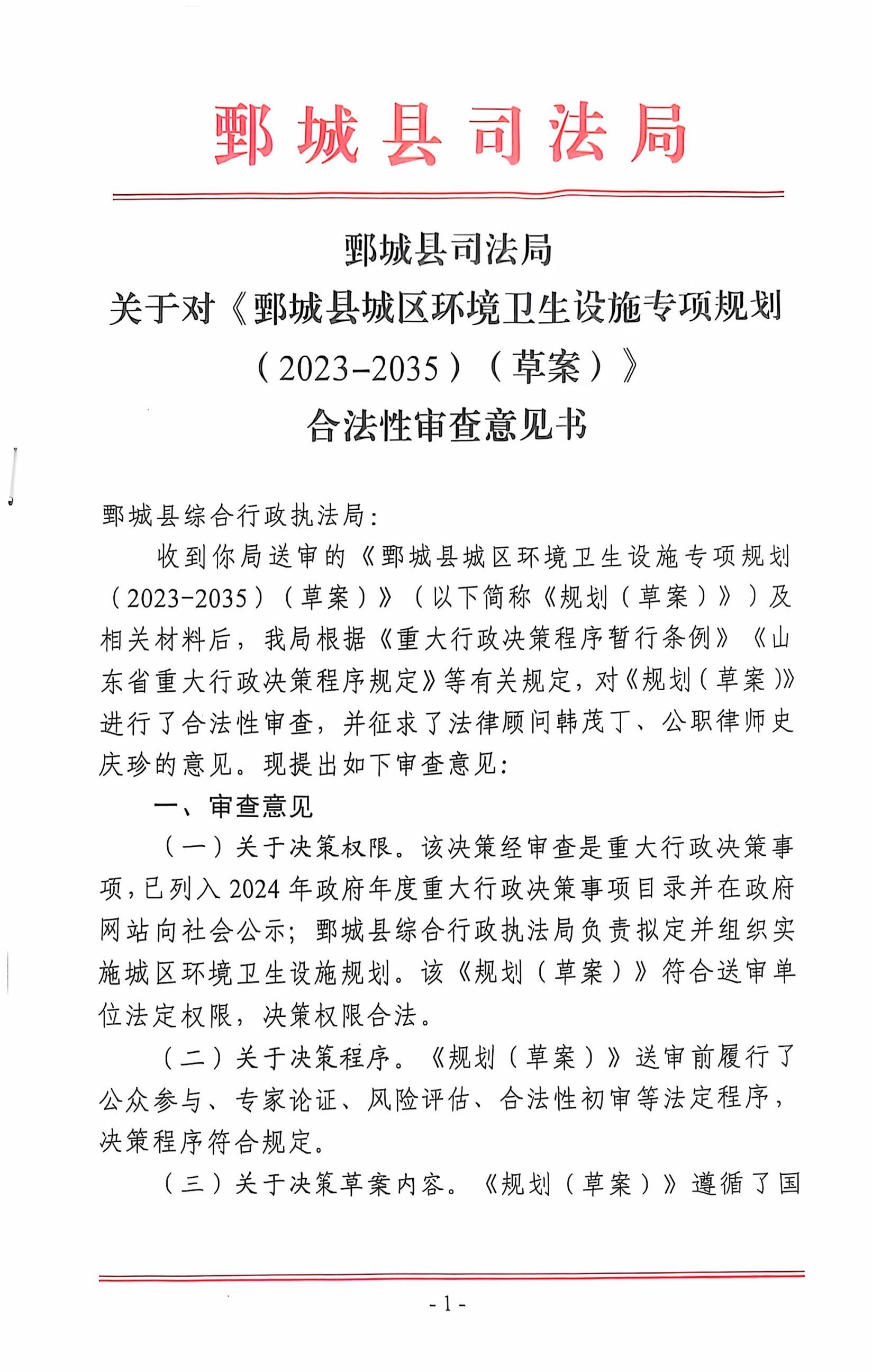 鄄城縣司法局關于《鄄城縣城區(qū)環(huán)境衛(wèi)生設施專項規(guī)劃(2023-2035年)》合法性審查意見書