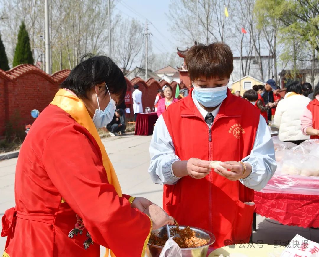 義診中,醫護人員耐心地為群眾量血壓、測血糖,并耐心解答各類健康問題,將健康送到群眾“家門口”。包餃子現場更是熱鬧非凡,暖意融融。志愿者們分工明確,有條不紊地調餡、搟皮、包餃子。不久,熱氣騰騰的餃子陸續出鍋,志愿者們將一碗碗餃子送到現場老人手中。裊裊升騰的熱火氣里,不僅承載著餃子的溫度,更傳遞出孝老愛親的中華傳統美德。鏗鏘有力的鼓聲拉開了恭祭華胥氏大典帷幕。從朗誦《華胥頌》、省級非物質文化遺產擔經舞表演、“九獻禮”、敬獻花籃、恭頌祭文等環節,展現出后人對華夏文明根脈的銘記與傳承。中華民族有著重視親情、感恩母親的優良傳統,活動最后,參祭人員紛紛在中華母親節倡議墻上簽名,讓孝道文化在新時代得以傳承和延續。恭祭大典完成后,一系列極具特色的活動有序開展,涵蓋非遺擔經、舞龍、武術、舞蹈等多個藝術門類,為現場觀眾帶來一場沉浸式的文化盛宴。現場還舉辦了義診、“百人餃子宴”3月31日,由鄄城縣文化和旅游局、彭樓鎮人民政府主辦,縣婦聯、縣融媒體中心、山東省伏羲堯舜文化研究會承辦的2025乙巳年全球華人恭祭華胥氏大典暨中華母親節倡議儀式在華胥故里鄄城縣彭樓鎮郭北口村舉行。菏澤市中華文化促進會、菏澤市傳統文化促進會、菏澤市曹州歷史文化研究院、鄄城縣傳統文化促進會、馬愛云醫院相關領導及周邊群眾200多人參加了活動。