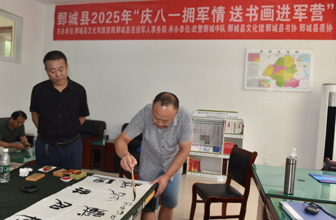 為熱烈慶祝中國人民解放軍建軍98周年,進一步弘揚擁軍優屬光榮傳統,密切軍民魚水情誼,2025年8月1日,由鄄城縣文化和旅游局、鄄城縣退役軍人事務局主辦,武警鄄城中隊、鄄城縣文化館、鄄城縣書法家協會、鄄城縣美術家協會共同承辦的“慶八一擁軍情 送書畫進軍營”活動在武警鄄城中隊營區成功舉辦。