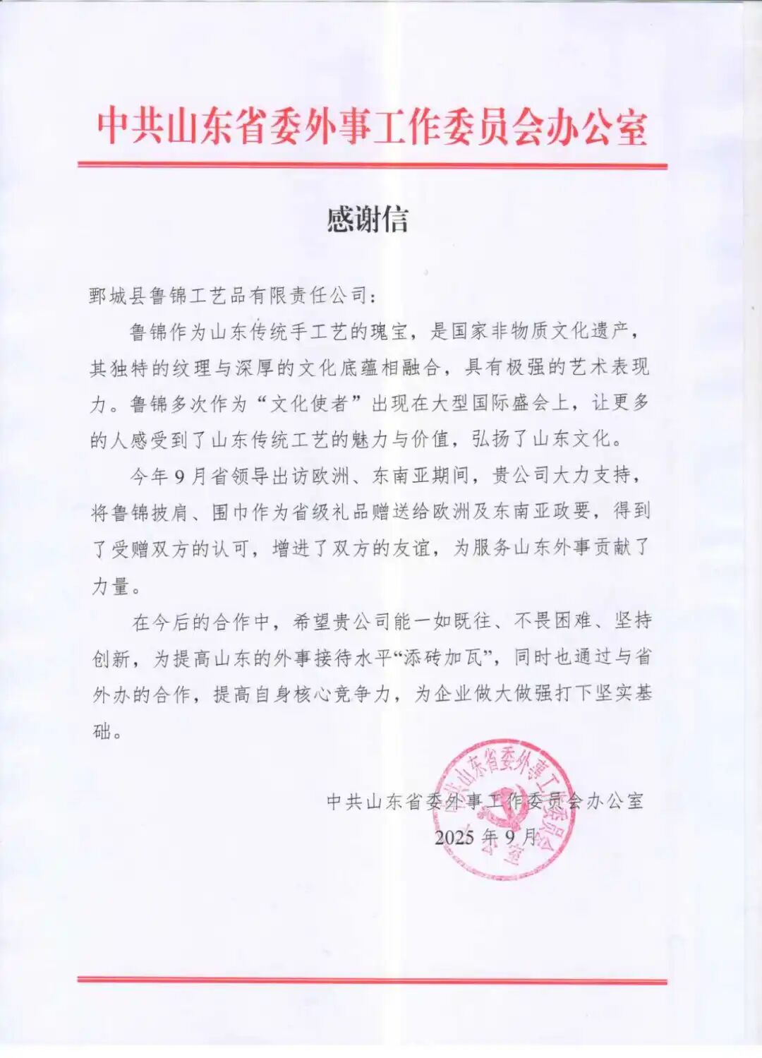 中共山東省委外事工作委員會辦公室在感謝信中充分肯定:“魯錦作為山東傳統手工藝的瑰寶,是國家非物質文化遺產,其獨特的紋理與深厚的文化底蘊相融合,具有極強的藝術表現力。”這份認可,不僅是對企業產品的肯定,更是對鄄城非遺保護傳承工作的褒獎。