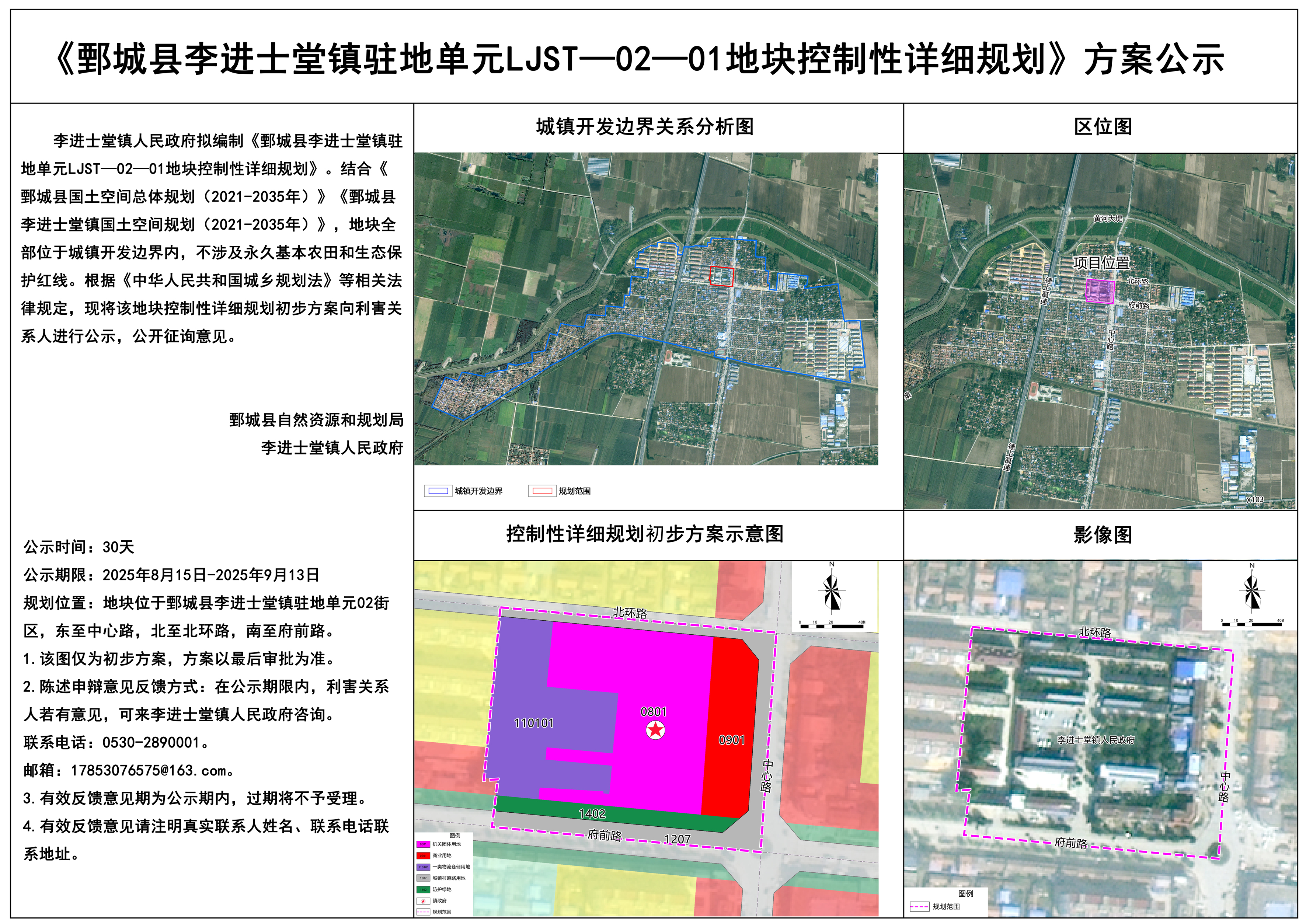 標  題: 《鄄城縣李進士堂鎮駐地單元LJST-02-01地塊控制性詳細規劃》方案公示 發布日期: 2025 年 08 月 15 日