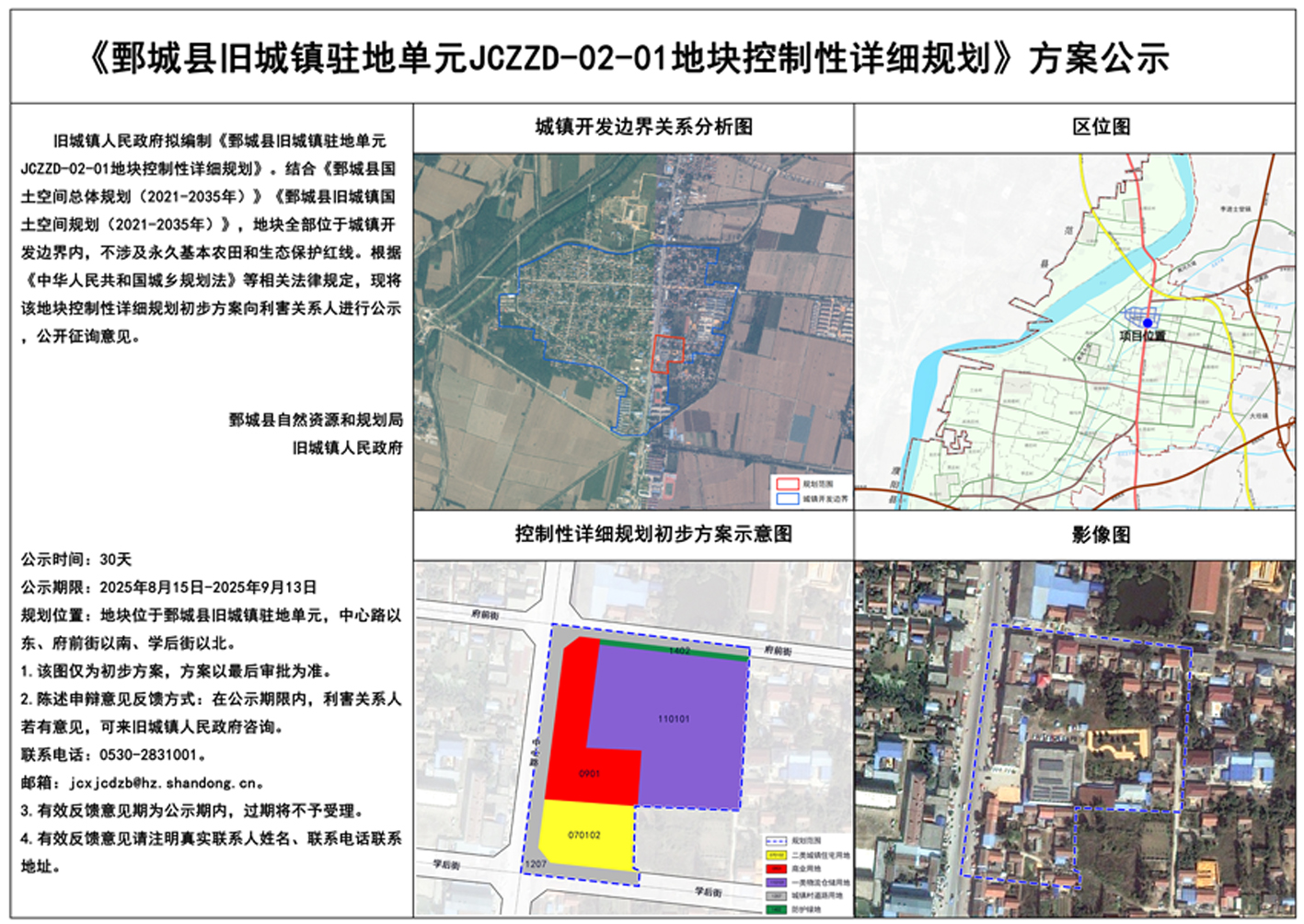 標  題: 《鄄城縣舊城鎮駐地單元JCZZD-02-01地塊控制性詳細規劃》方案公示 發布日期: 2025 年 08 月 15 日