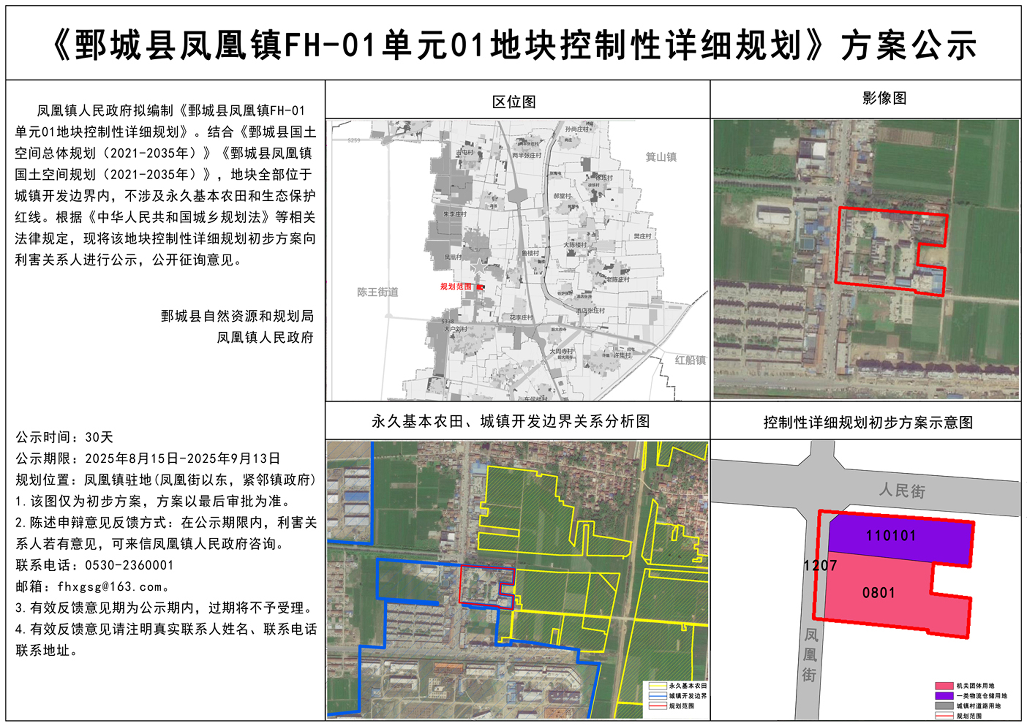 標  題: 《鄄城縣風凰鎮FH-01單元01地塊控制性詳細規劃》方案公示 發布日期: 2025 年 08 月 15 日