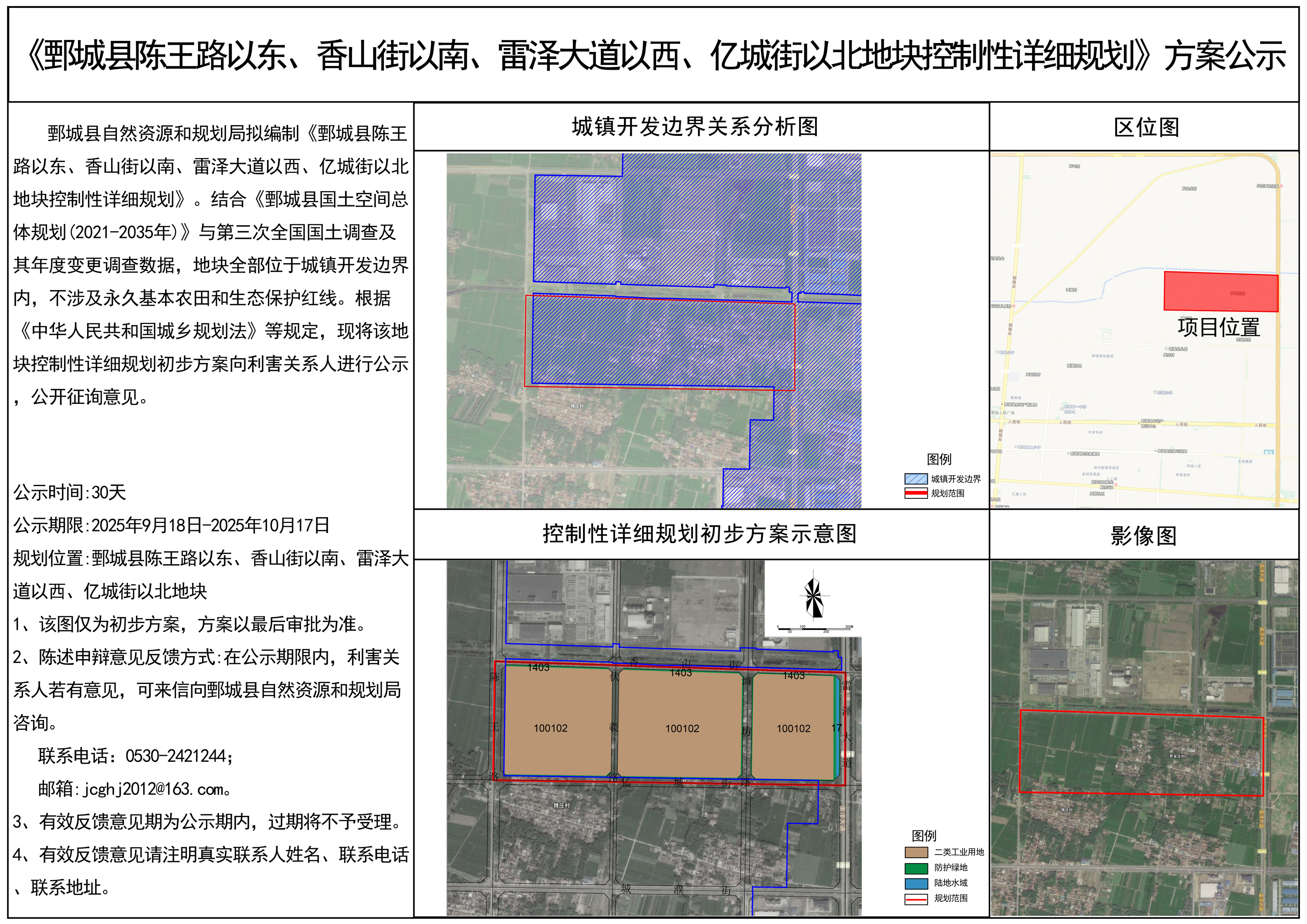 標  題: 《鄄城縣陳王路以東、香山街以南、雷澤大道以西、億城街以北地塊控制性詳細規劃》方案公示 發布日期: 2025 年 09 月 18 日