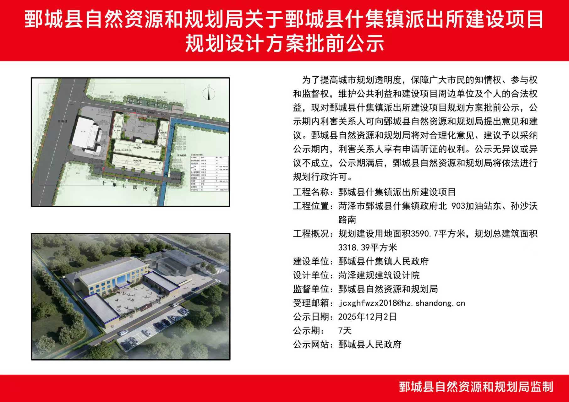 標  題: 鄄城縣自然資源和規劃局關于鄄城縣什集鎮派出所建設項目規劃設計方案批前公示 發布日期: 2025 年 12 月 02 日