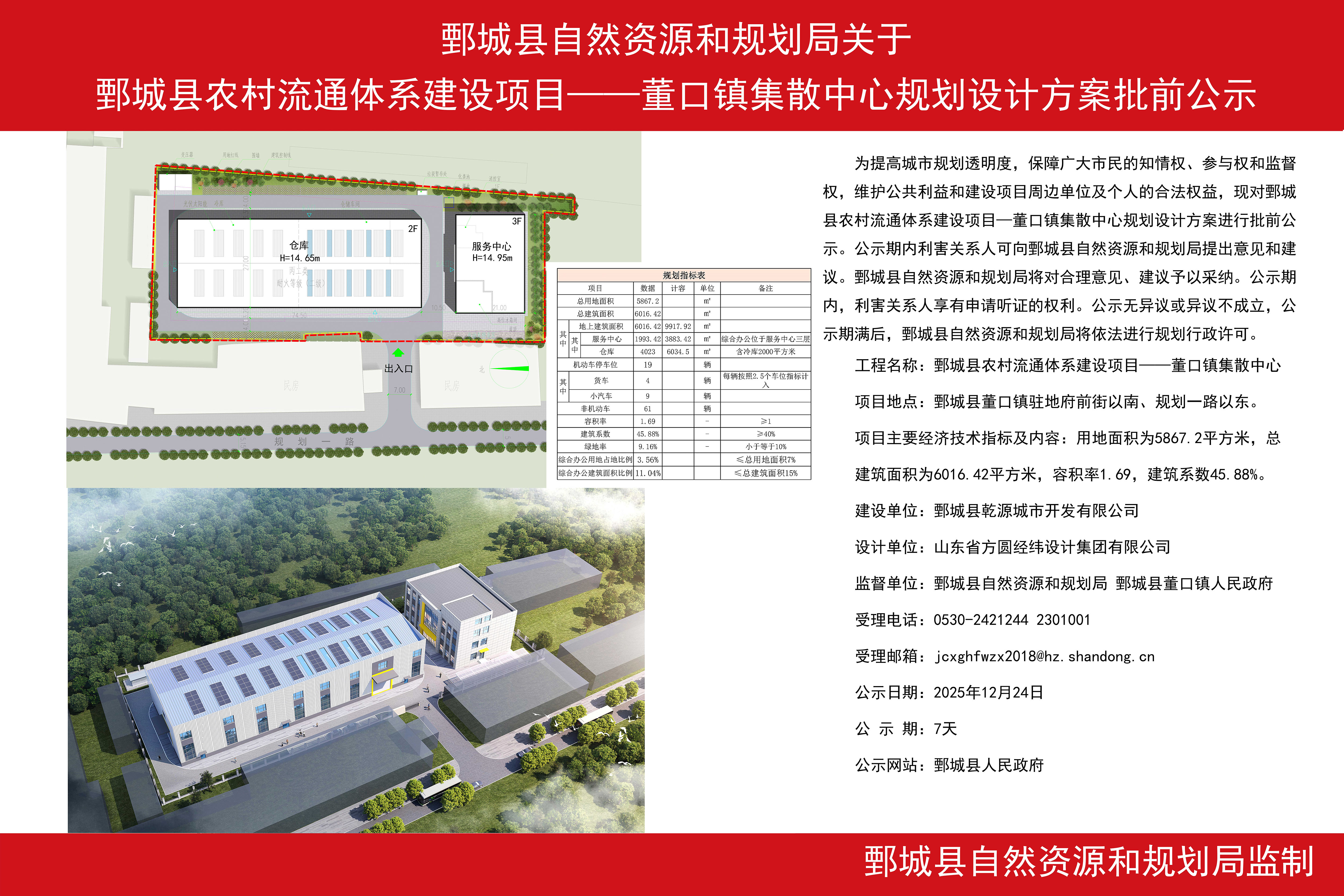 標  題: 鄄城縣自然資源和規劃局關于鄄城縣農村流通體系建設項目——董口鎮集散中心規劃設計方案批前公示 發布日期: 2025 年 12 月 24 日