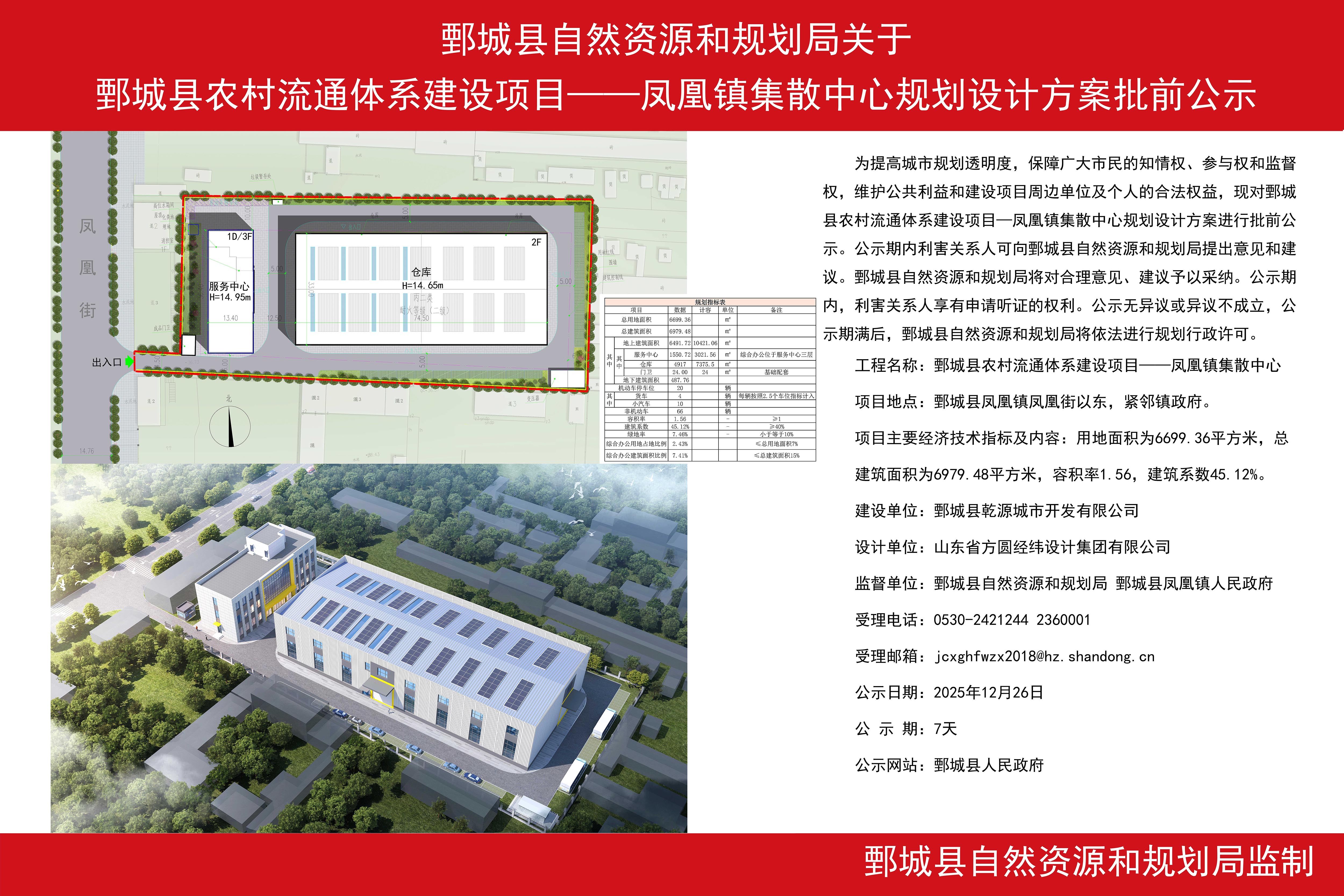 標  題: 鄄城縣自然資源和規劃局關于鄄城縣農村流通體系建設項目——鳳凰鎮集散中心規劃設計方案批前公示 發布日期: 2025 年 12 月 26 日