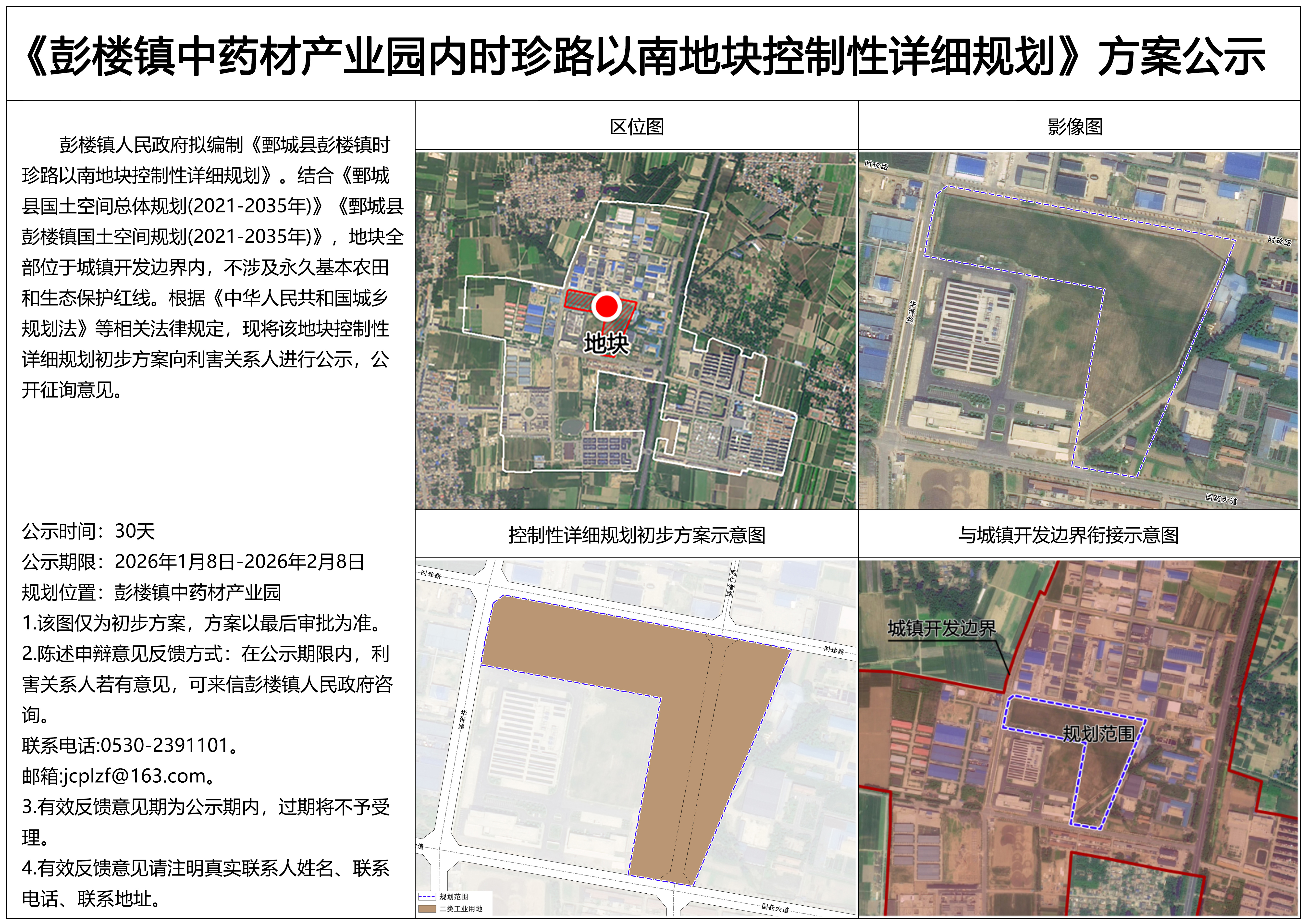 - 標(biāo) 題:《彭樓鎮(zhèn)中藥材產(chǎn)業(yè)園內(nèi)時(shí)珍路以南地塊控制性詳細(xì)規(guī)劃》方案公示